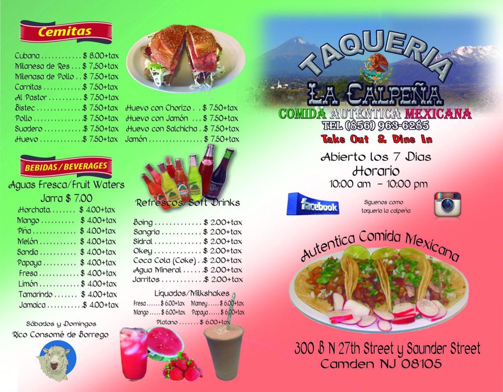 Introducing the menu at La Calpeña, a delightful Mexican eatery located at 300 N 27th St, Camden, NJ. This small yet vibrant spot is celebrated for its authentic flavors and warm atmosphere. La Calpeña specializes in cemitas, a traditional Mexican sandwich that comes in various options like the succulent Carnitas and flavorful Al Pastor, each priced at just $10.